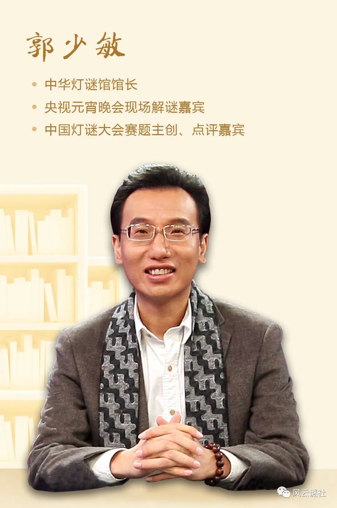 郭少敏,号“文虎居主人”,著名灯谜艺术家、顶尖猜谜高手、职业灯谜人。个人专著《灯谜逻辑》。