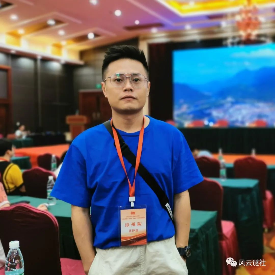 连仲嘉,网名:区区不才、阿嘉,80后,福建漳州龙海人,现为风云谜社会员,漳州市非遗(灯谜)代表性传承人。自幼与灯谜结缘,2015年起较系统学习灯谜猜制,并开始参加现场、网络谜赛,偶有获奖、获佳。对灯谜展猜、电控竞猜等活动的主持亦有浓厚兴趣,略有心得。